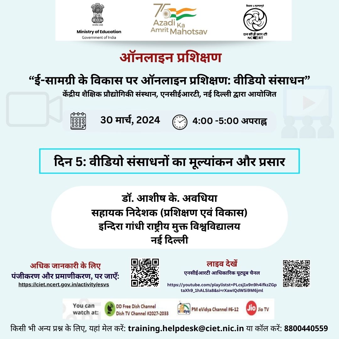 | दिन 5: शनिवार 30 मार्च 2024 | वीडियो संसाधनों का मूल्यांकन और प्रसार | डॉ. आशीष के. अवधिया, सहायक निदेशक (प्रशिक्षण एवं विकास), इन्दिरा गांधी राष्ट्रीय मुक्त विश्वविद्यालय, नई दिल्ली | Day 5 | Video | |