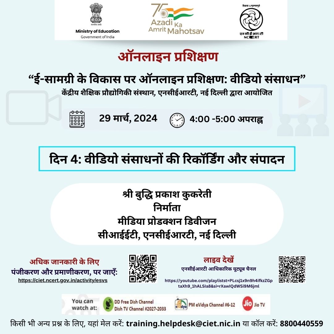 | दिन 4: शुक्रवार 29 मार्च 2024 | वीडियो संसाधनों की रिकॉर्डिंग और संपादन | श्री बुद्धि प्रकाश, (निर्माता, सीआईईटी-एनसीईआरटी), श्री वीरेंद्र कुमार (संपादक, सीआईईटी-एनसीईआरटी) | Day 4 | Presentation_Day 4 | Video |