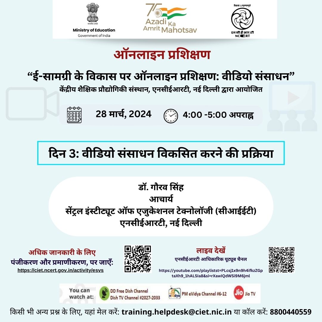 | दिन 3: गुरुवार, 28 मार्च 2024 | वीडियो संसाधन विकसित करने की प्रक्रिया | डॉ. गौरव सिंह, आचार्य , मीडिया प्रोडक्शन डिवीजन, सीआईईटी, राष्ट्रीय शैक्षिक अनुसंधान और प्रशिक्षण परिषद् (एनसीईआरटी) | Day 3 | Presentation_Day 3 | Video |