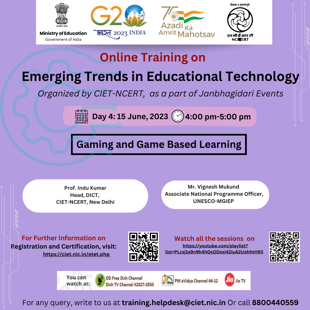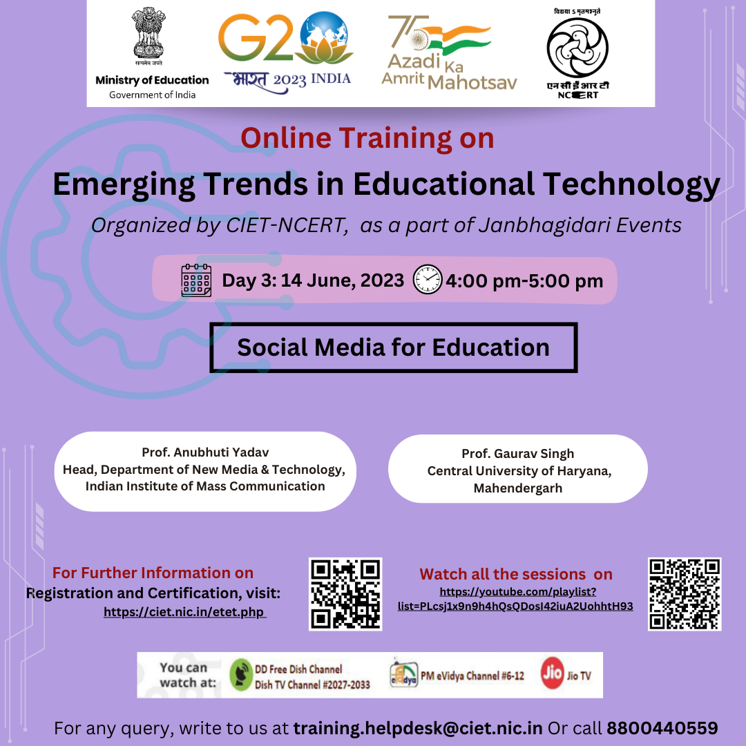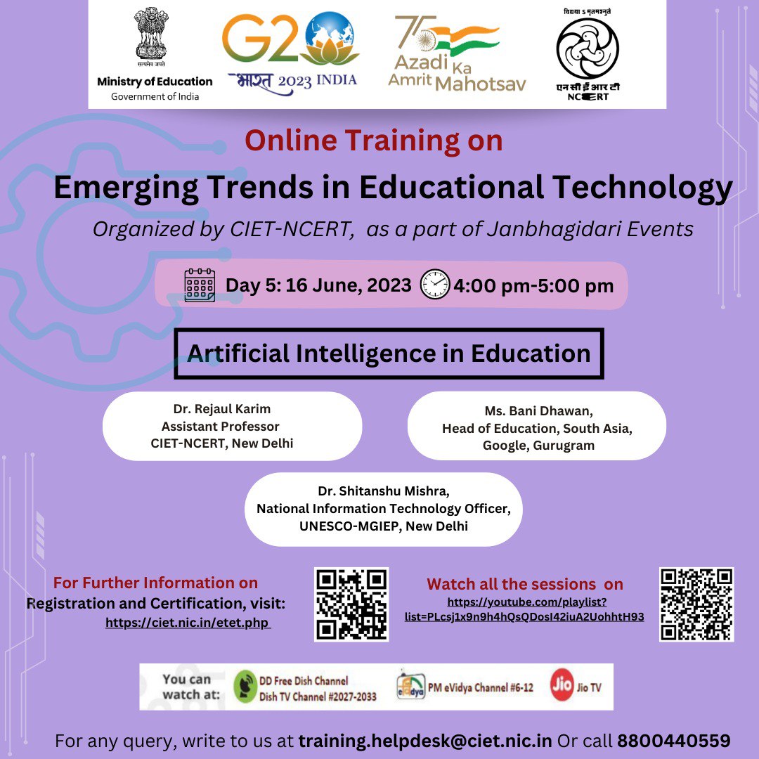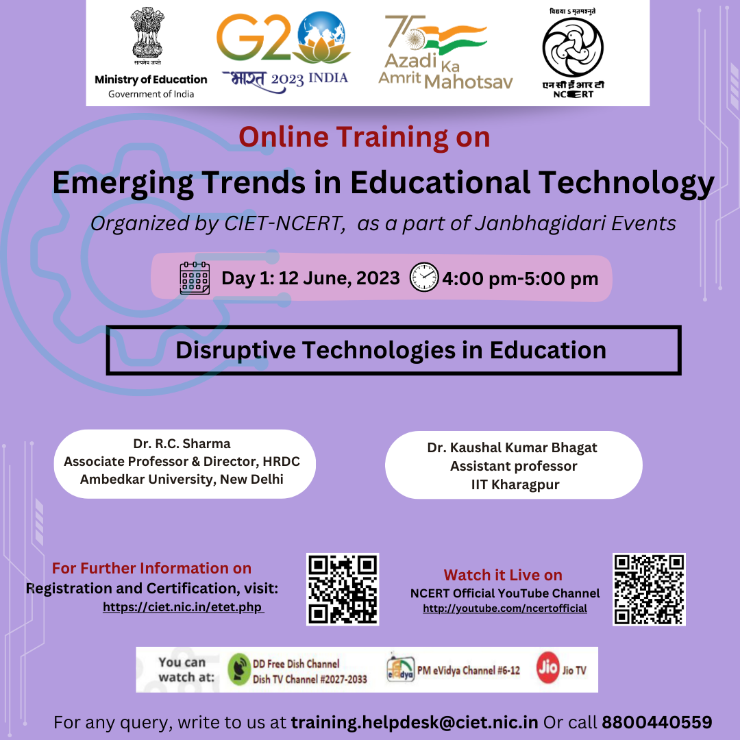 As a part of Jan Bhagidari events, CIET-NCERT is conducting various activities online. With this in view, CIET-NCERT is organizing a five hours online training on “Emerging Trends in Educational Technology” from 12-16 June, 2023 from 4.00 pm - 5.00 pm pm to leverage the understanding of teachers, students, teacher educators, administrators, and other stakeholders of school education on the need, importance and usage of emerging trends in educational technology that can be implemented in teaching, learning and assessment.