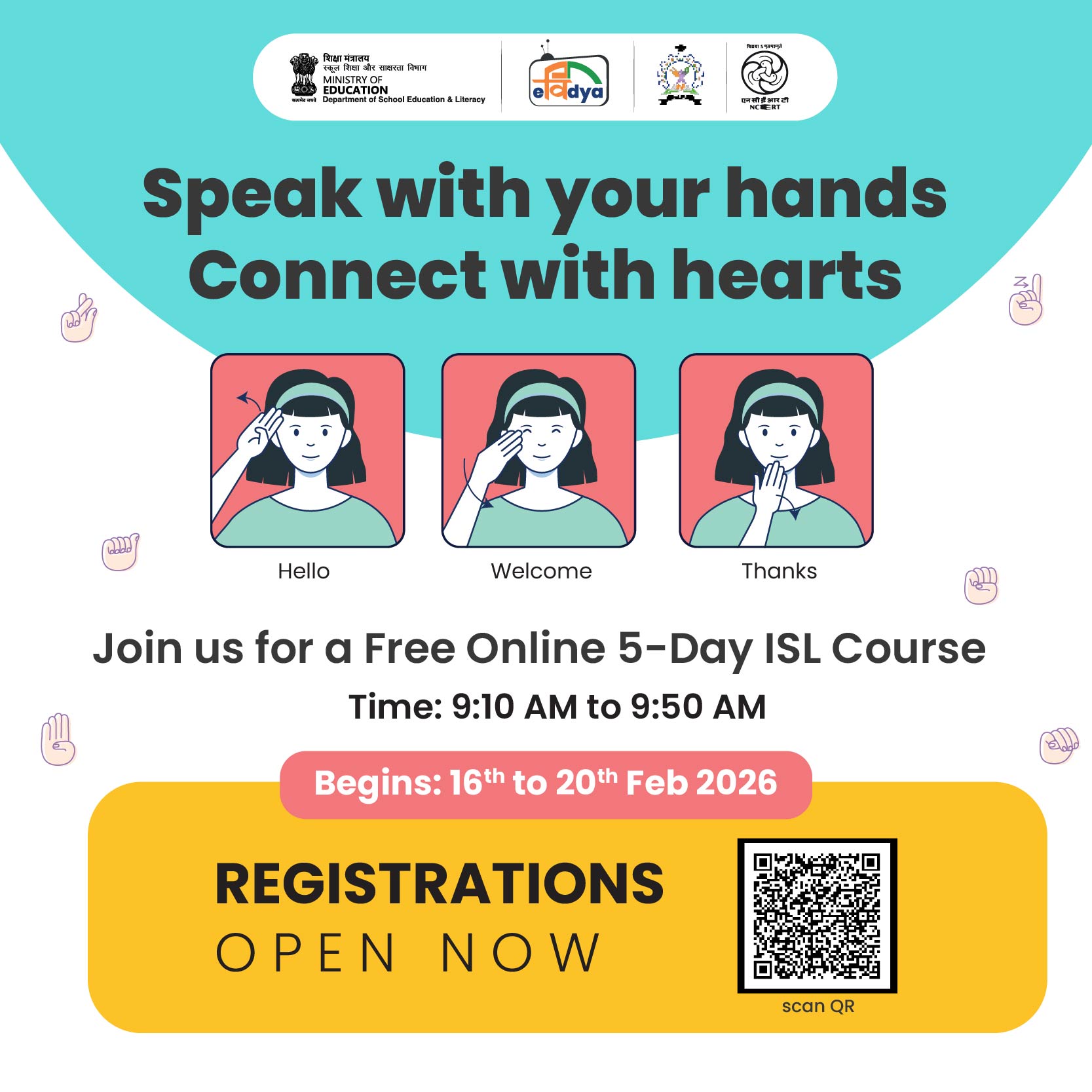 The Basic Indian Sign Language (ISL) Course, is rooted in the need to bridge communication gaps and foster inclusivity for the Deaf community in India. Despite the recognition of ISL as a medium of instruction under the Rights of Persons with Disabilities (RPwD) Act, 2016, and reaffirmed within the broader vision for inclusive and equitable education articulated in the National Education Policy (NEP) 2020, awareness and functional proficiency in ISL remain limited among the general public, educators, and public service professionals. To address this gap, NCERT has developed a Basic ISL Course in collaboration with the Indian Sign Language Research and Training Centre (ISLRTC). This course attempts to address the pressing communication barriers faced by the Deaf community and the non-Deaf community and vice versa. It empowers educators, families, and service providers with essential skills to communicate effectively with deaf individuals, promoting a more inclusive society where the needs of all citizens are recognized and met.