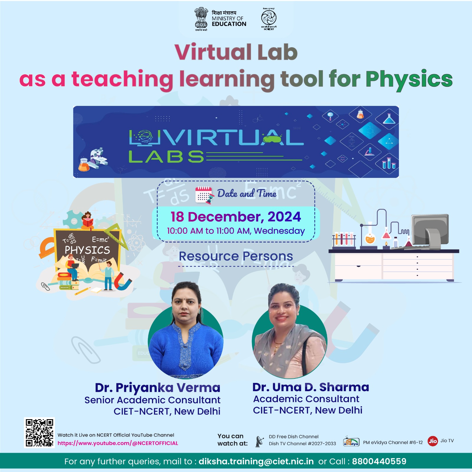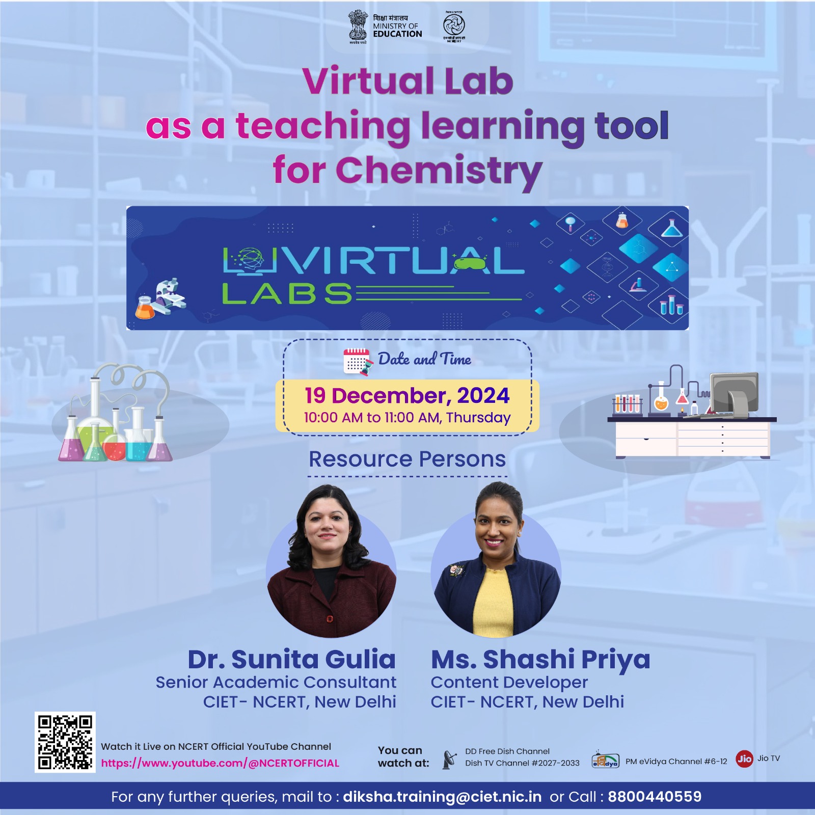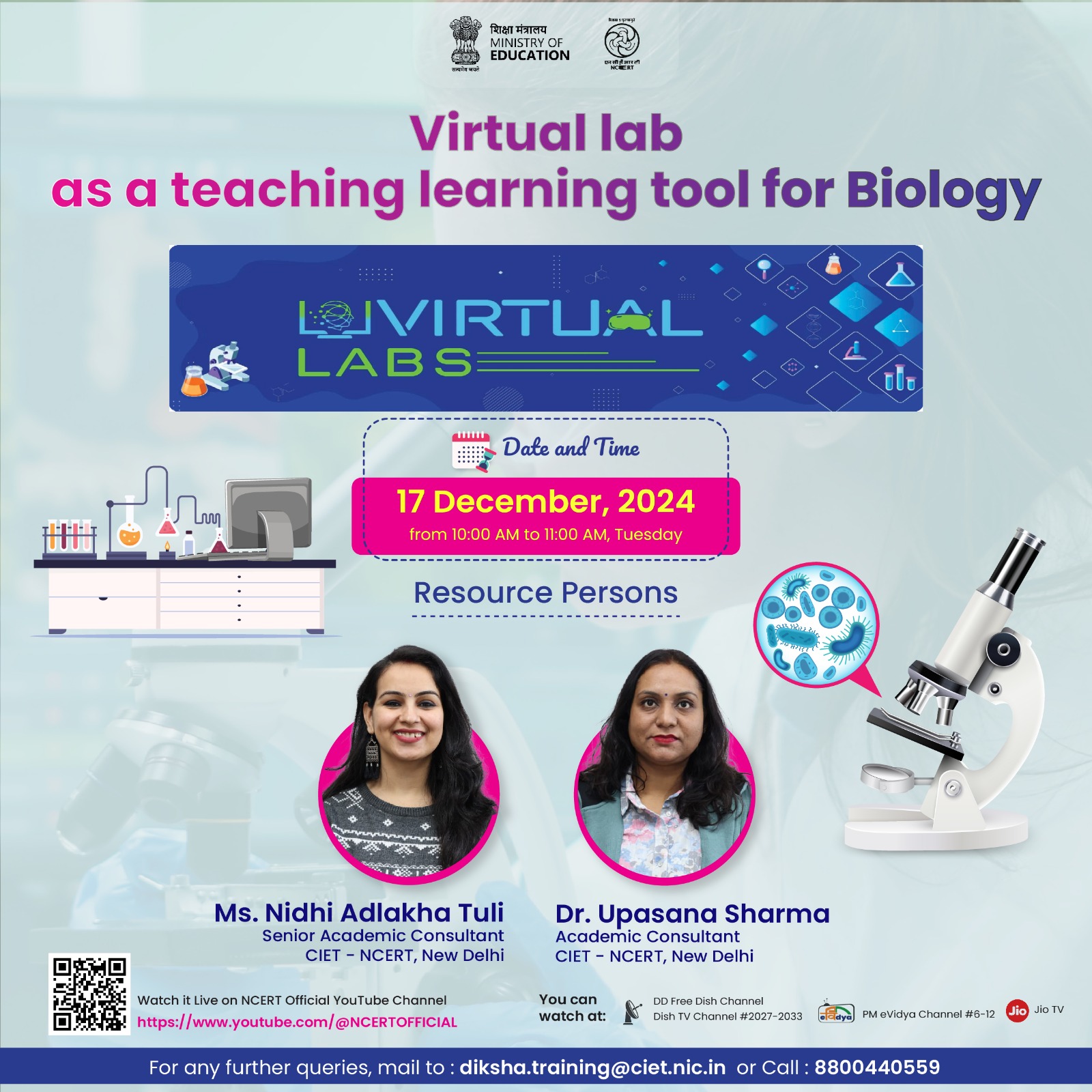 In this context, CIET-NCERT is organizing an online training on “Integration of Virtual Labs in Teaching-Learning” Phase 3 from 16-26 December 2024 from 10:00 am - 11:00 am to leverage the understanding of teachers, students, teacher educators, administrators, and various stakeholders on utilization of DIKSHA Virtual Labs to enrich the classroom experiences.