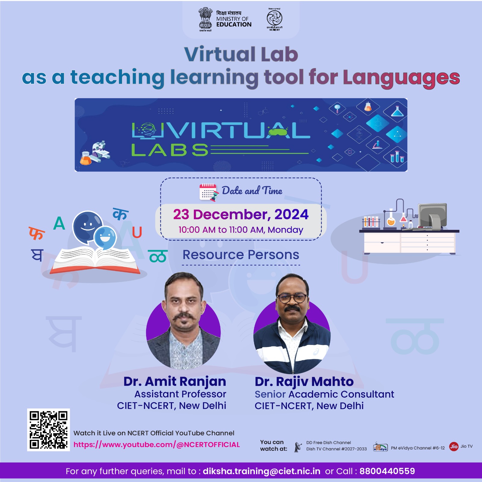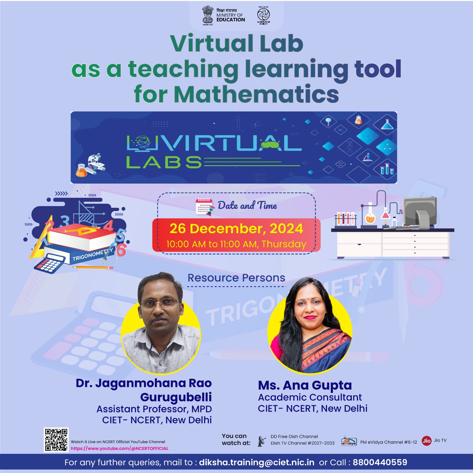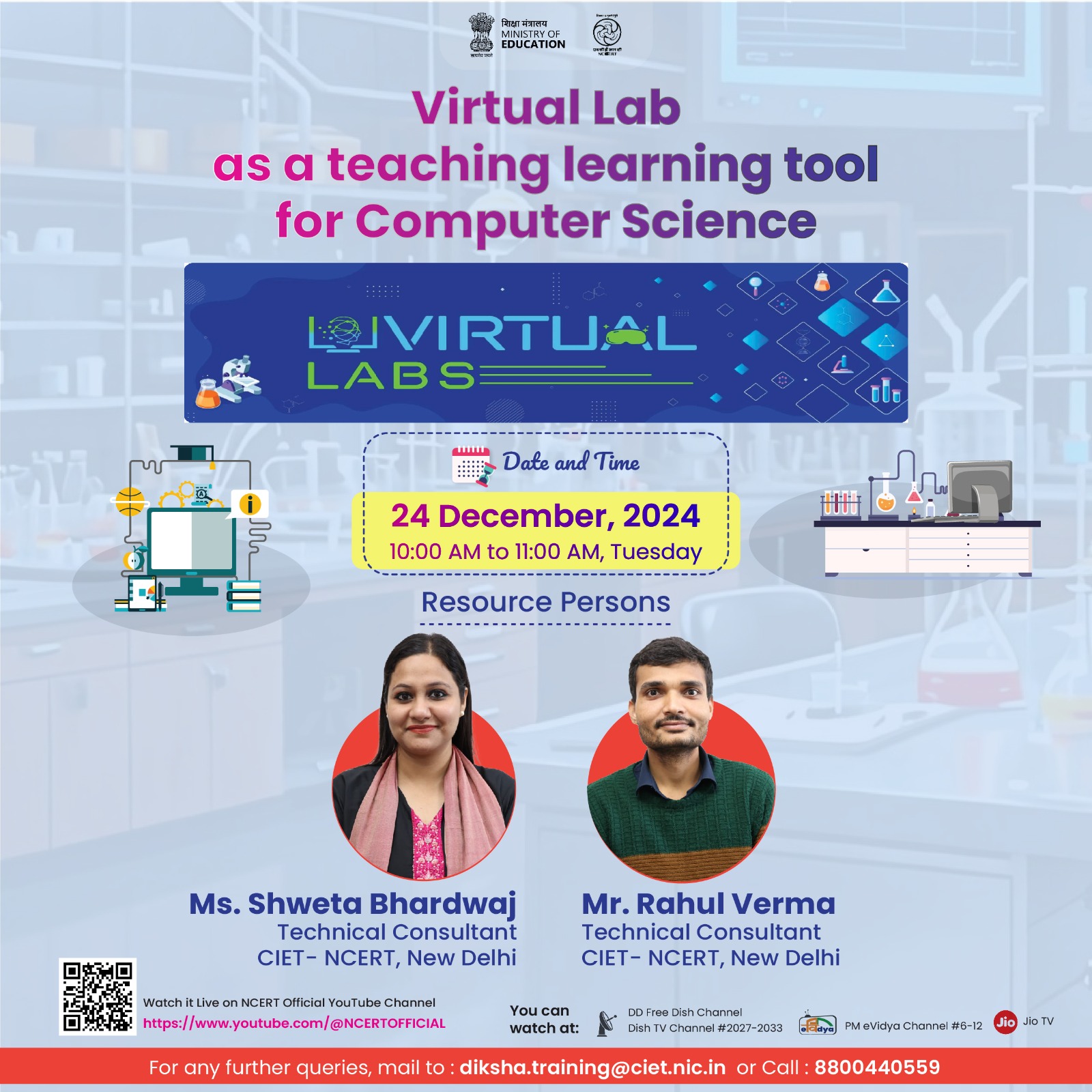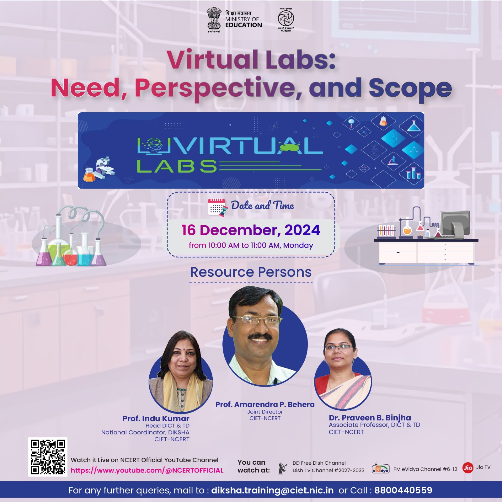 In this context, CIET-NCERT is organizing an online training on “Integration of Virtual Labs in Teaching-Learning” Phase 3 from 16-26 December 2024 from 10:00 am - 11:00 am to leverage the understanding of teachers, students, teacher educators, administrators, and various stakeholders on utilization of DIKSHA Virtual Labs to enrich the classroom experiences.