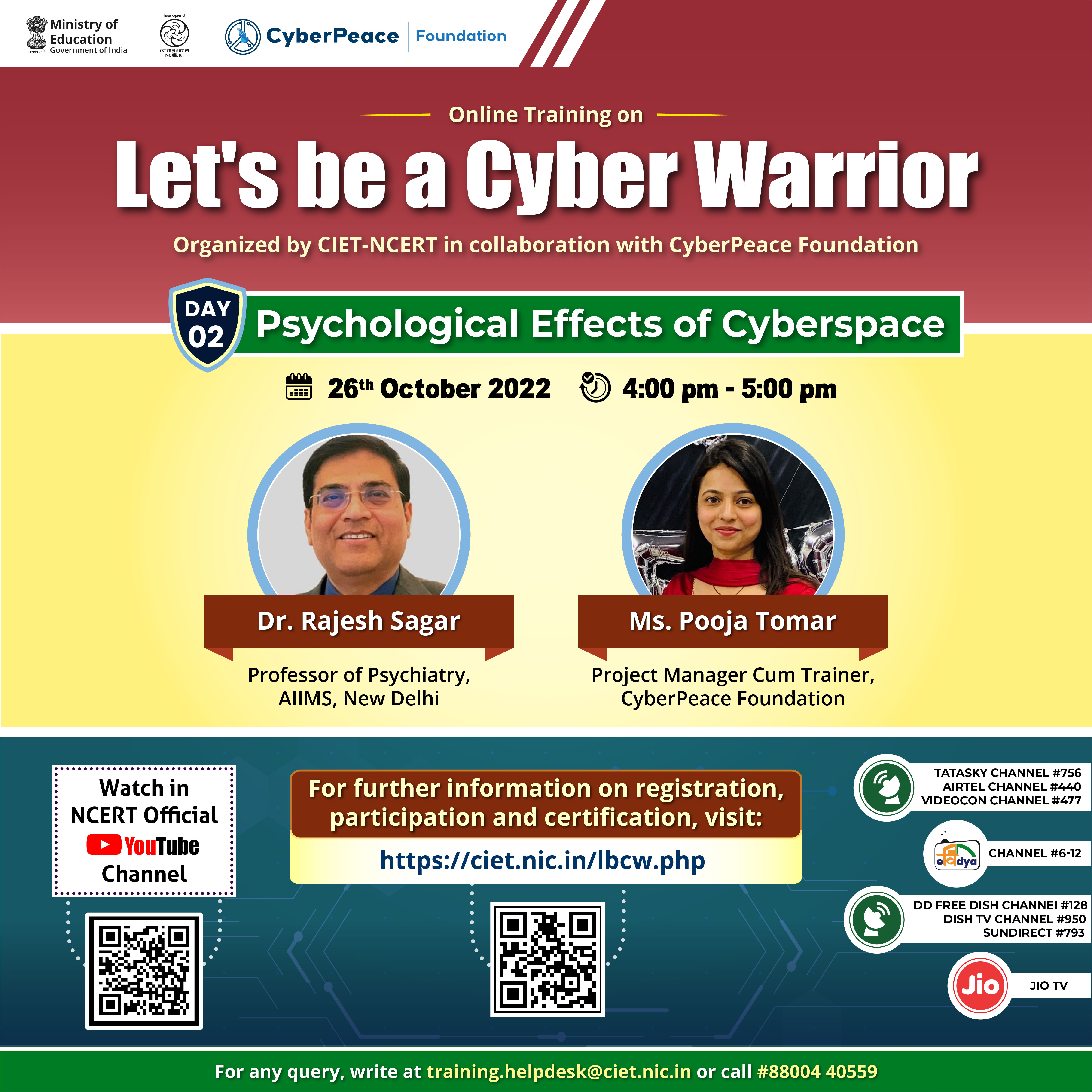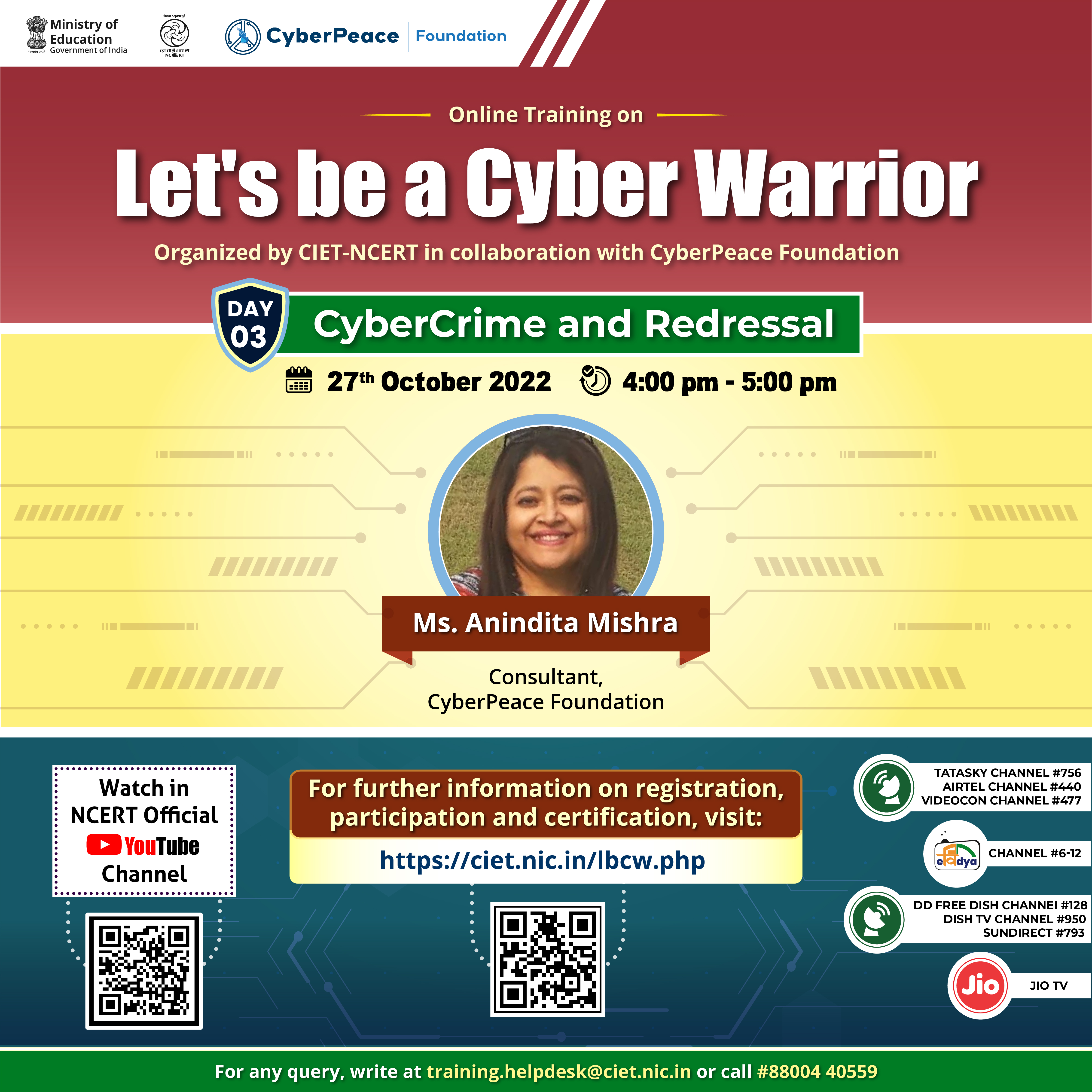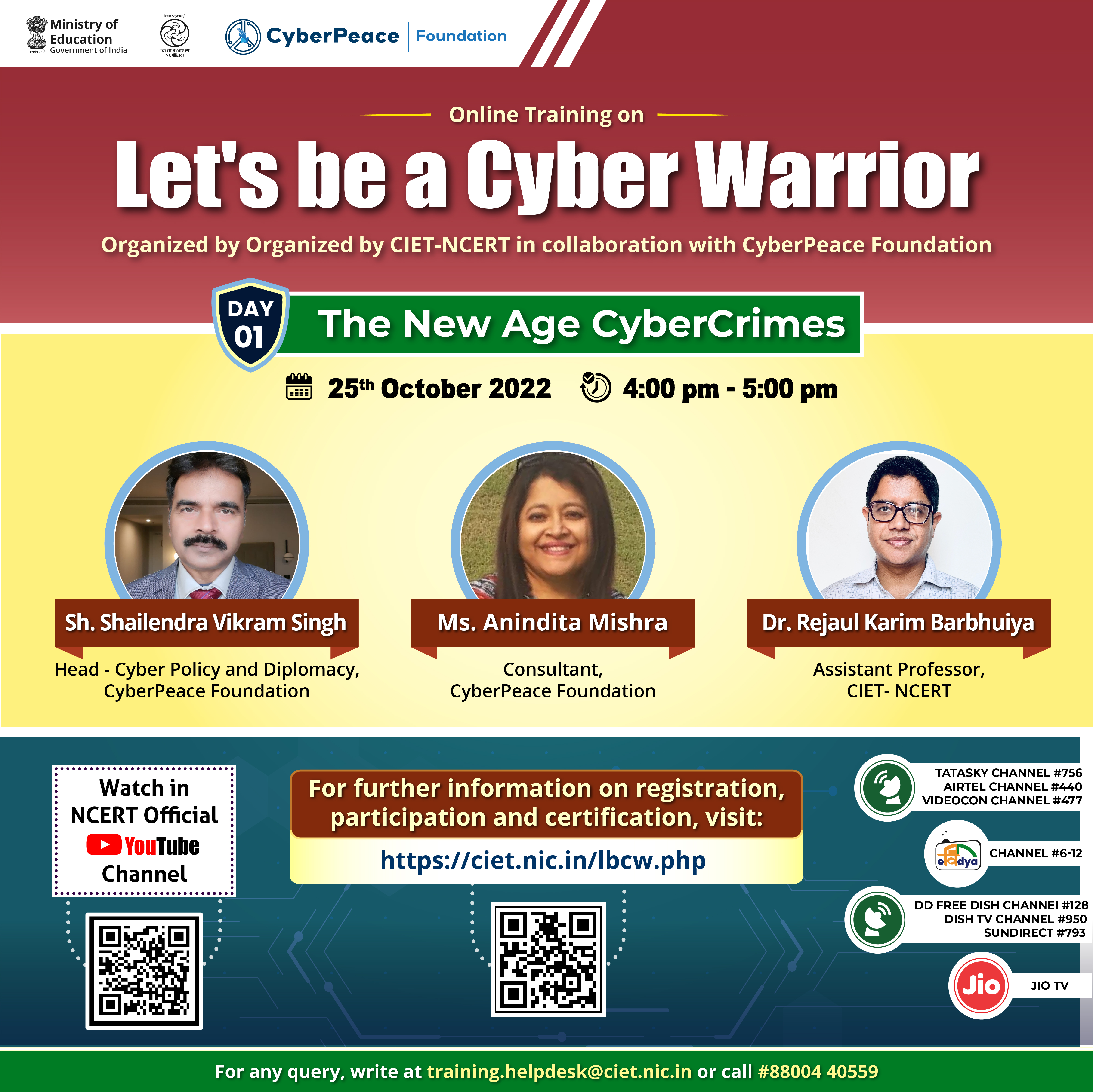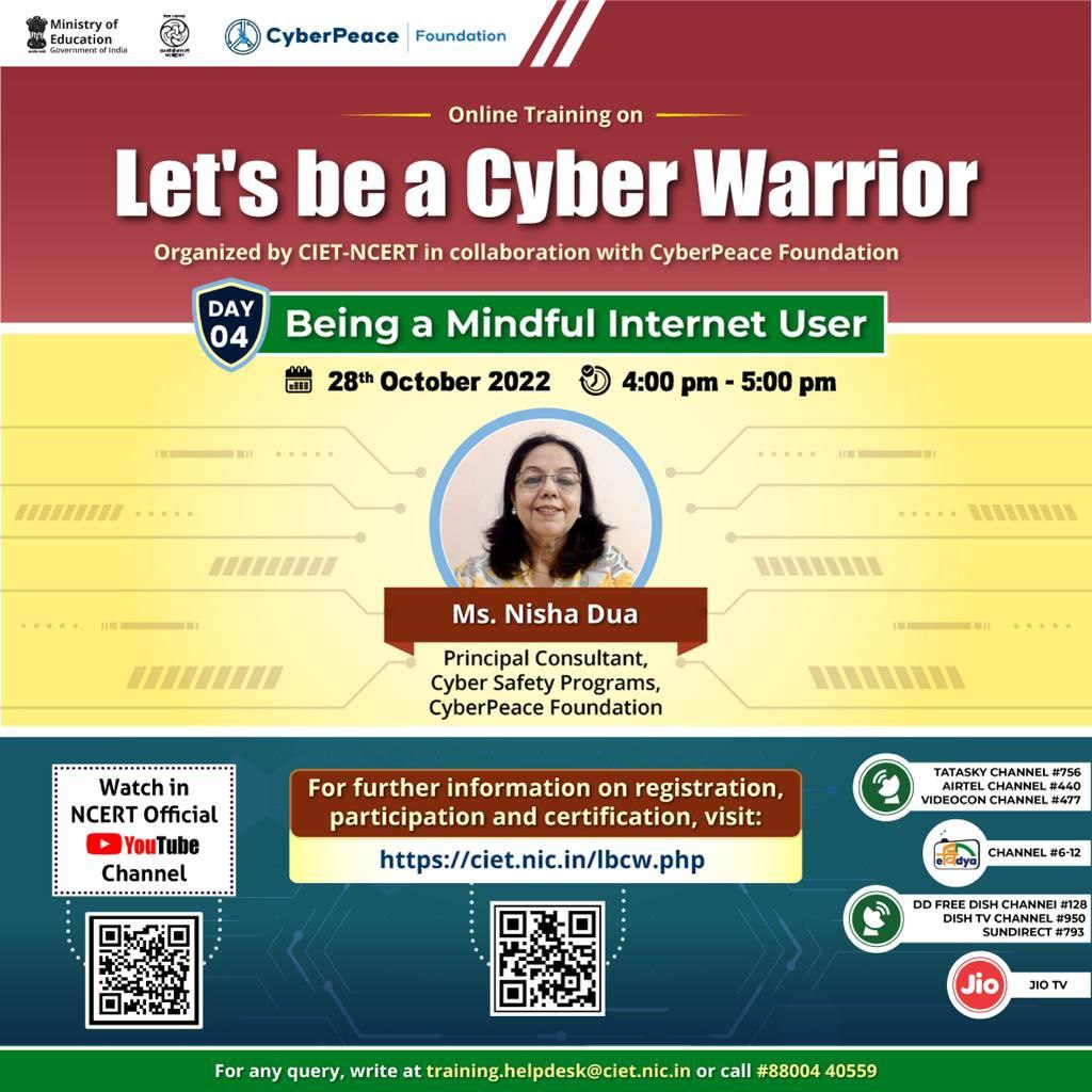 In this regard, CIET-NCERT in collaboration with CyberPeace Foundation is organising a four-day online training on “Let's be a Cyber Warrior” from 25-28 October, 2022 from 4.00 pm - 5.00 pm to enhance the understanding of teachers, students, teacher educators, and various stakeholders on being a cyber warrior and ensure Cyber Safety and Security. The online training will be live on NCERT official YouTube Channel- https://www.youtube.com/c/NCERTOFFICIAL and also be simulcast through PMeVidya DTH TV Channels numbered #6-12 and Jio TV mobile app.
