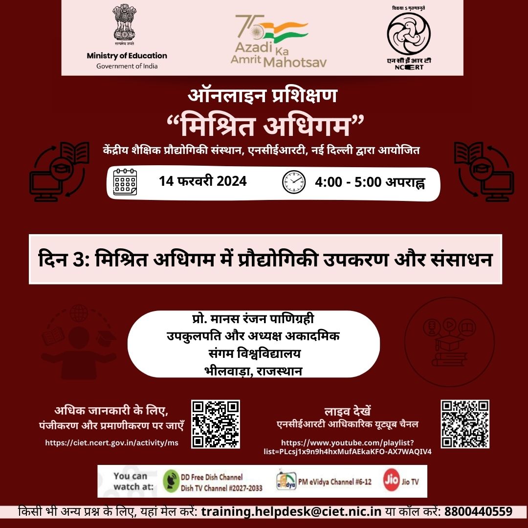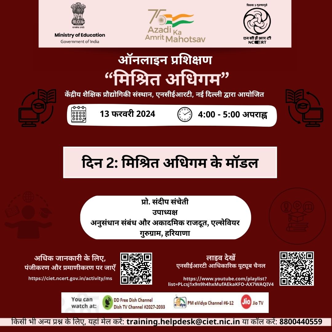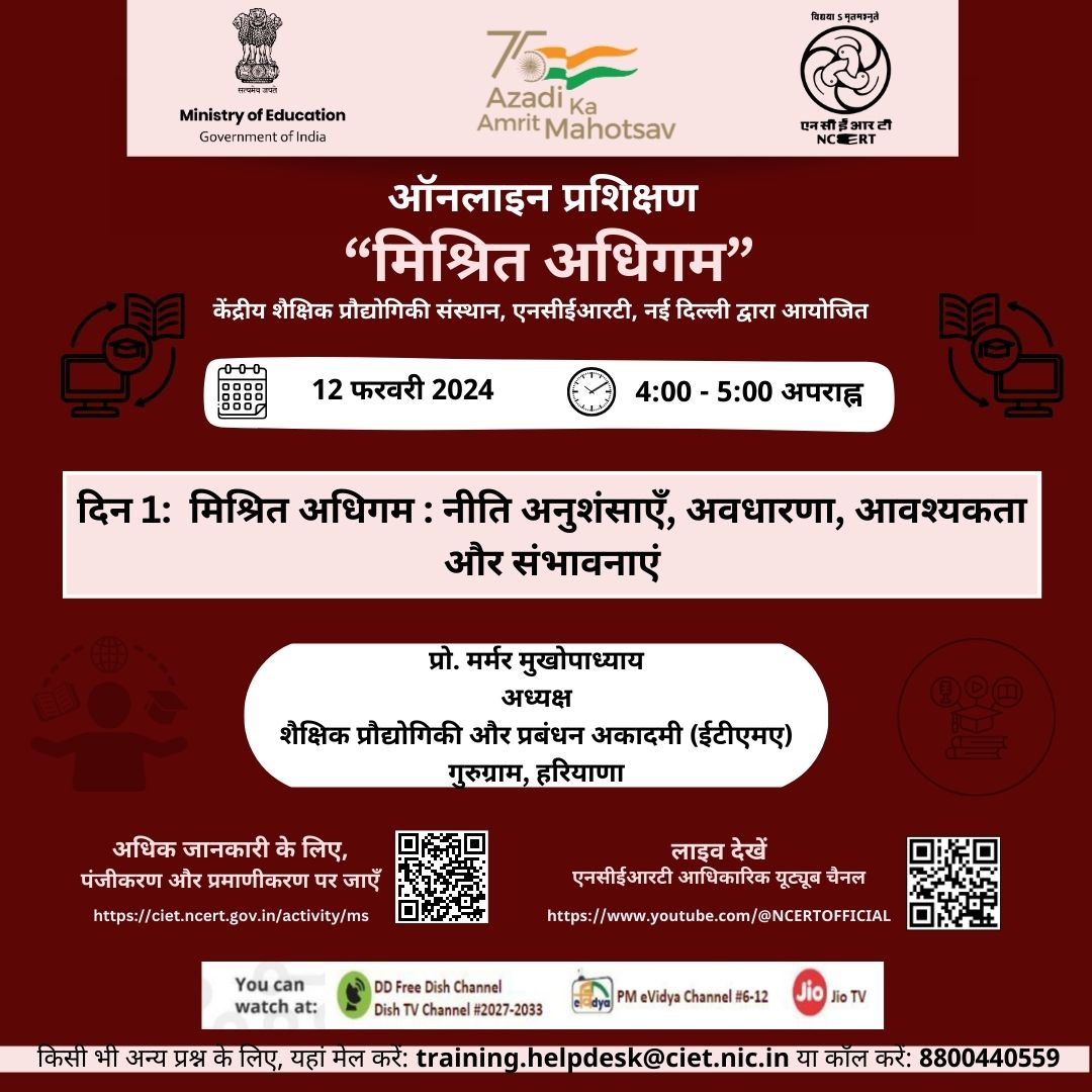 फरवरी 2024 महीने की श्रृंखला के एक भाग के रूप में, CIET-NCERT 12 से 16 फरवरी 2024 तक शाम 4:00 बजे से शाम 5:00 बजे तक "मिश्रित अधिगम" पर पांच घंटे के ऑनलाइन प्रशिक्षण का आयोजित कर रहा है। ये सत्र मिश्रित अधिगम की अवधारणा, आवश्यकता और संभावनाओं और सहायक क्षेत्रों पर शिक्षकों, छात्रों, शिक्षक प्रशिक्षकों, प्रशासकों और अन्य हितधारकों की समझ को बढ़ाएंगे।