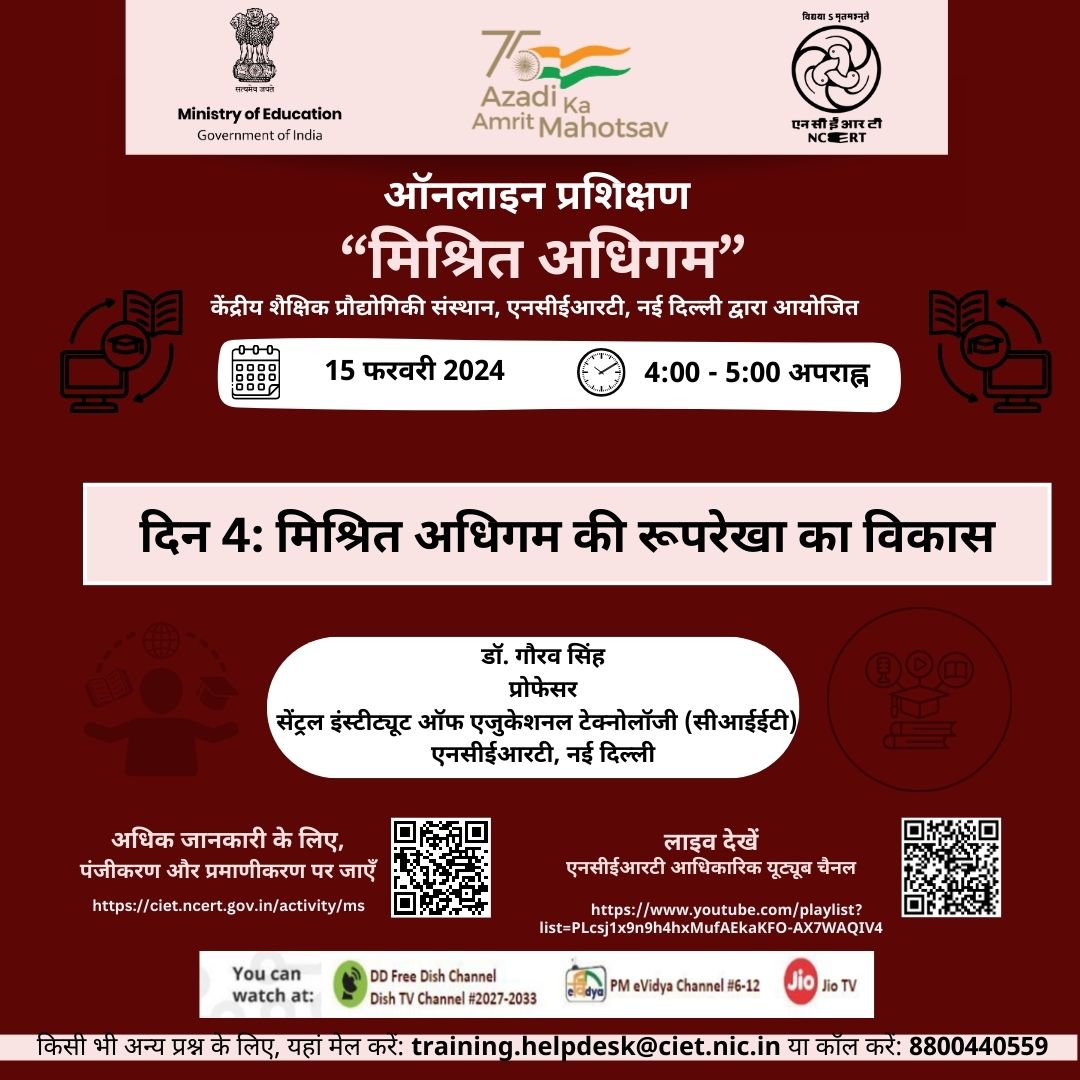 | दिन 4: गुरूवार 15 फरवरी 2024 | मिश्रित अधिगम की रूपरेखा का विकास | डॉ. गौरव सिंह प्रोफेसर, सेंट्रल इंस्टीट्यूट ऑफ एजुकेशनल टेक्नोलॉजी (सीआईईटी), एनसीईआरटी, नई दिल्ली -110016 | Day 4 | Video | |
