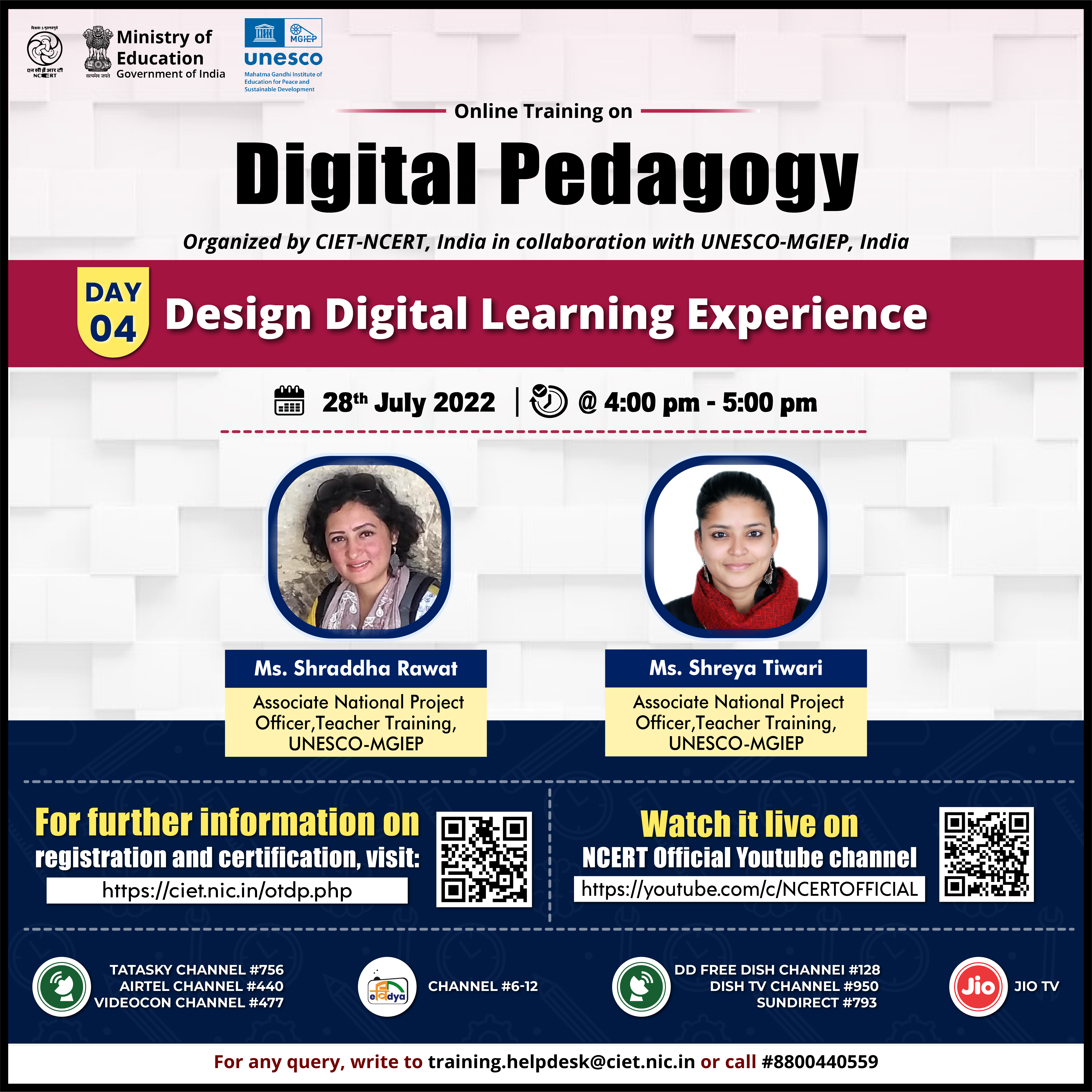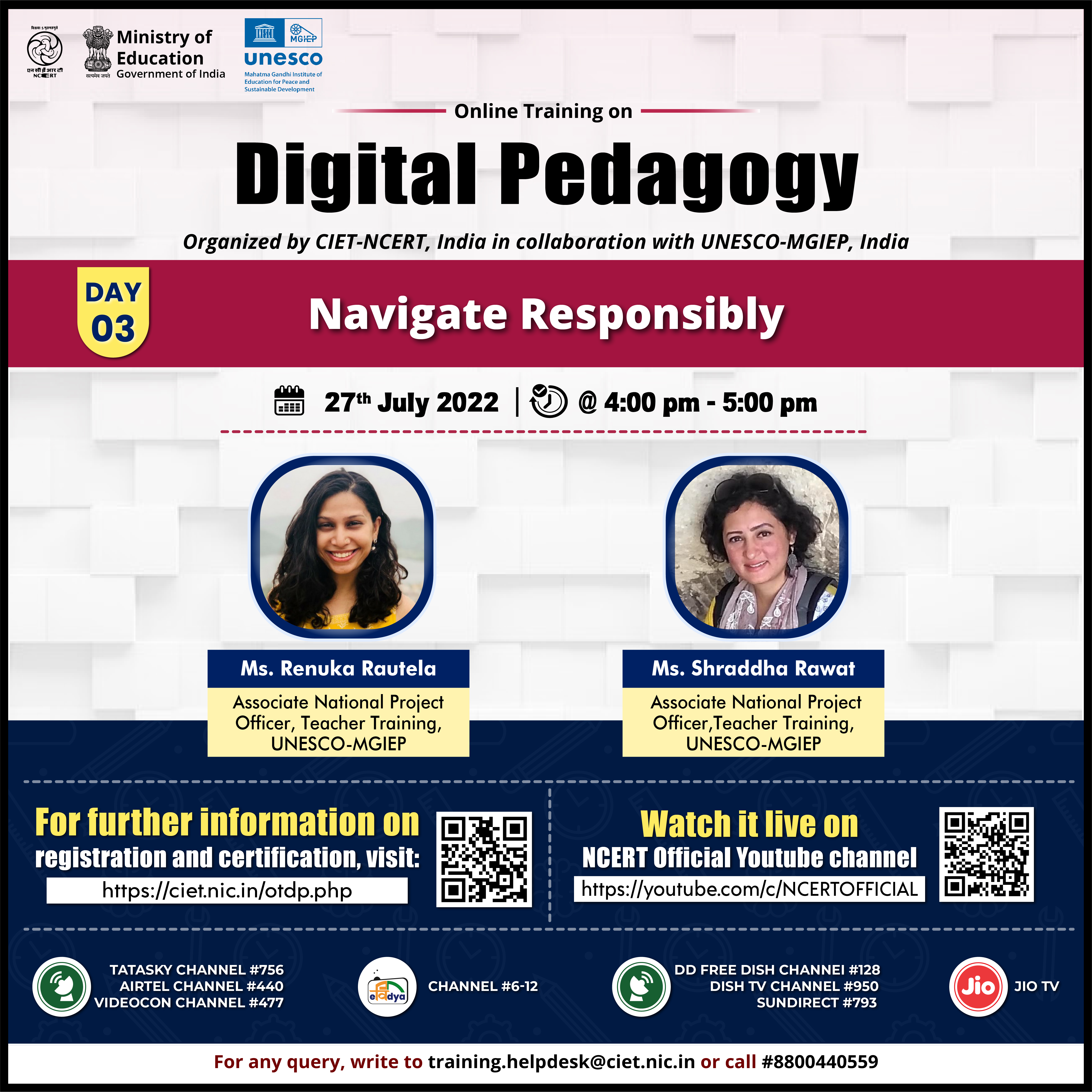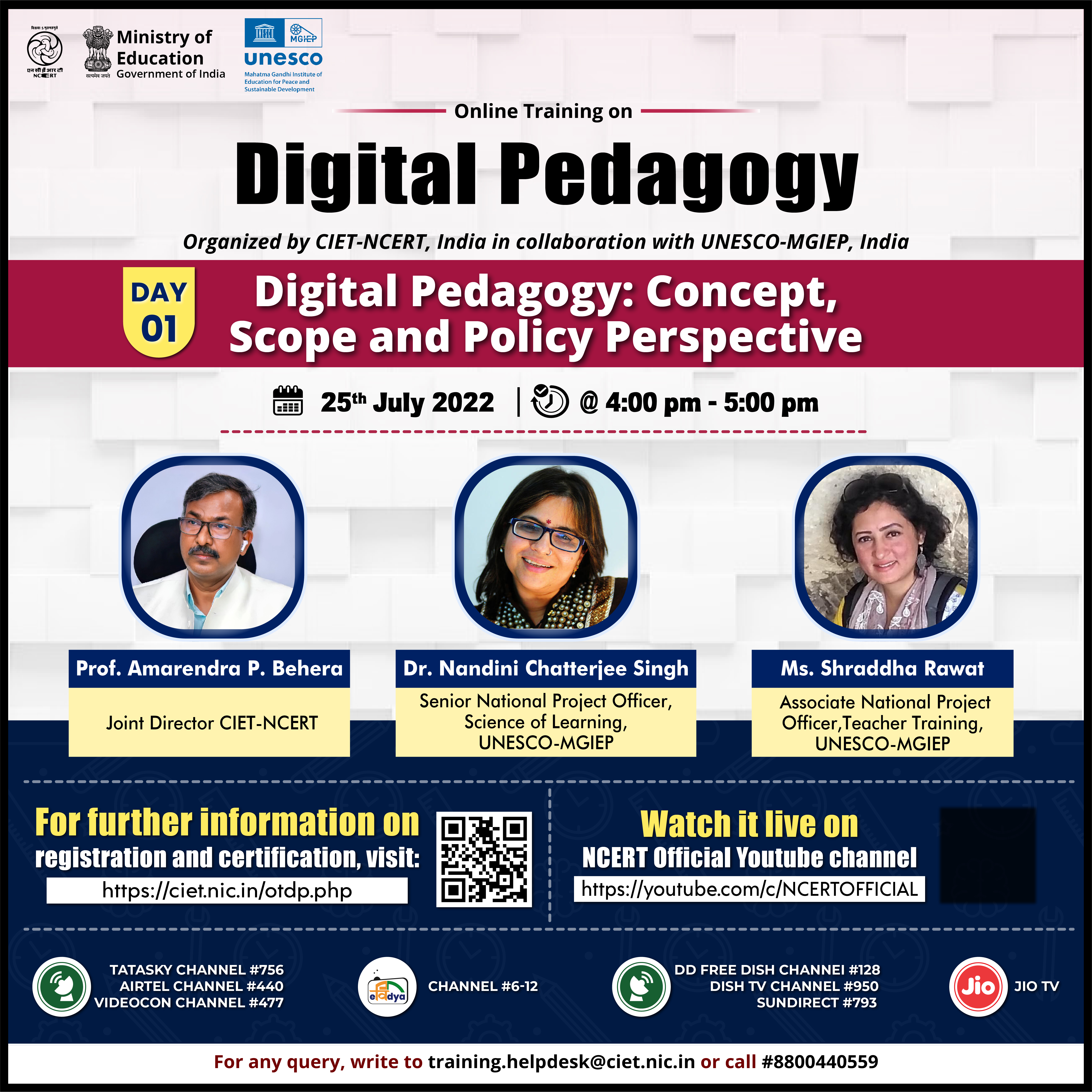 With the vision of enhancing professional skills of the teacher, CIET-NCERT in collaboration with UNESCO-MGIEP, is organizing a five-day online training on “Digital Pedagogy” from 25-29 July 2022 from 4.00 pm - 5.00 pm to leverage the understanding of teachers, students, teacher educators, administrators, and various stakeholders to integrate digital pedagogical practices in the teaching-learning process in order to enrich classroom experiences. The training is built upon four themes that represent the different dimensions of a teacher’s digital pedagogy competence. Together, they enable teachers to meaningfully integrate technology in their professional practice and create inclusive and impactful learning experiences. The online training will be live on NCERT official YouTube channel- https://www.youtube.com/c/NCERTOFFICIAL and also be simulcast through PMeVidya DTH TV Channels numbered #6-12 and Jio TV mobile app.