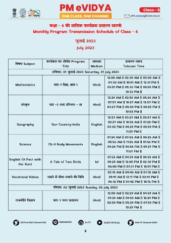 कक्षा - 6 की मासिक कार्यक्रम प्रिारण िारणी