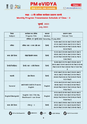 कक्षा - 2 की मासिक कार्यक्रम प्रिारण िारणी