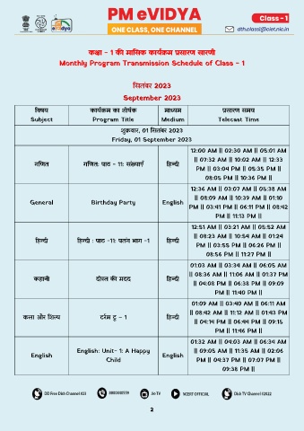 कक्षा - 1 की मासिक कार्यक्रम प्रिारण िारणी