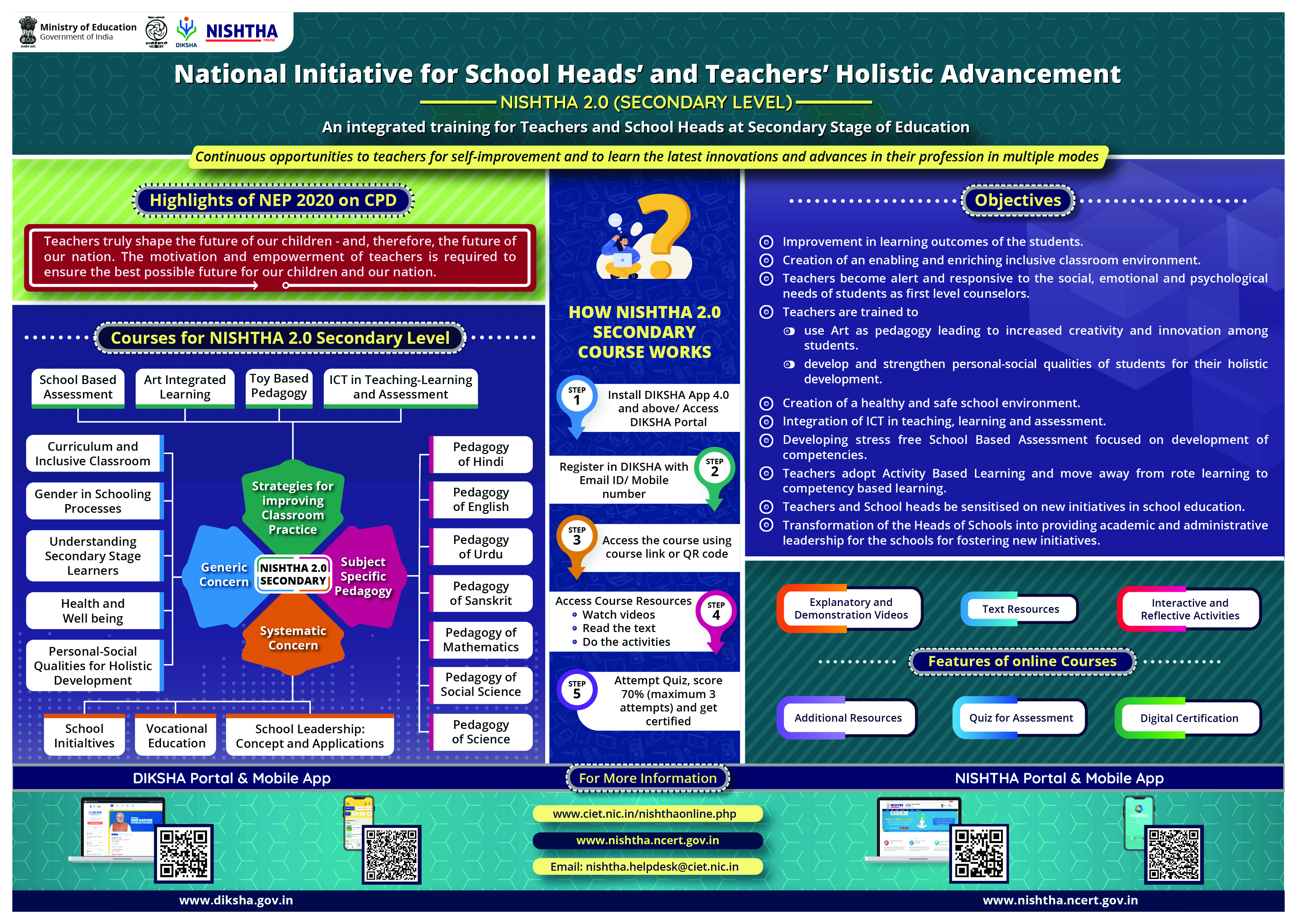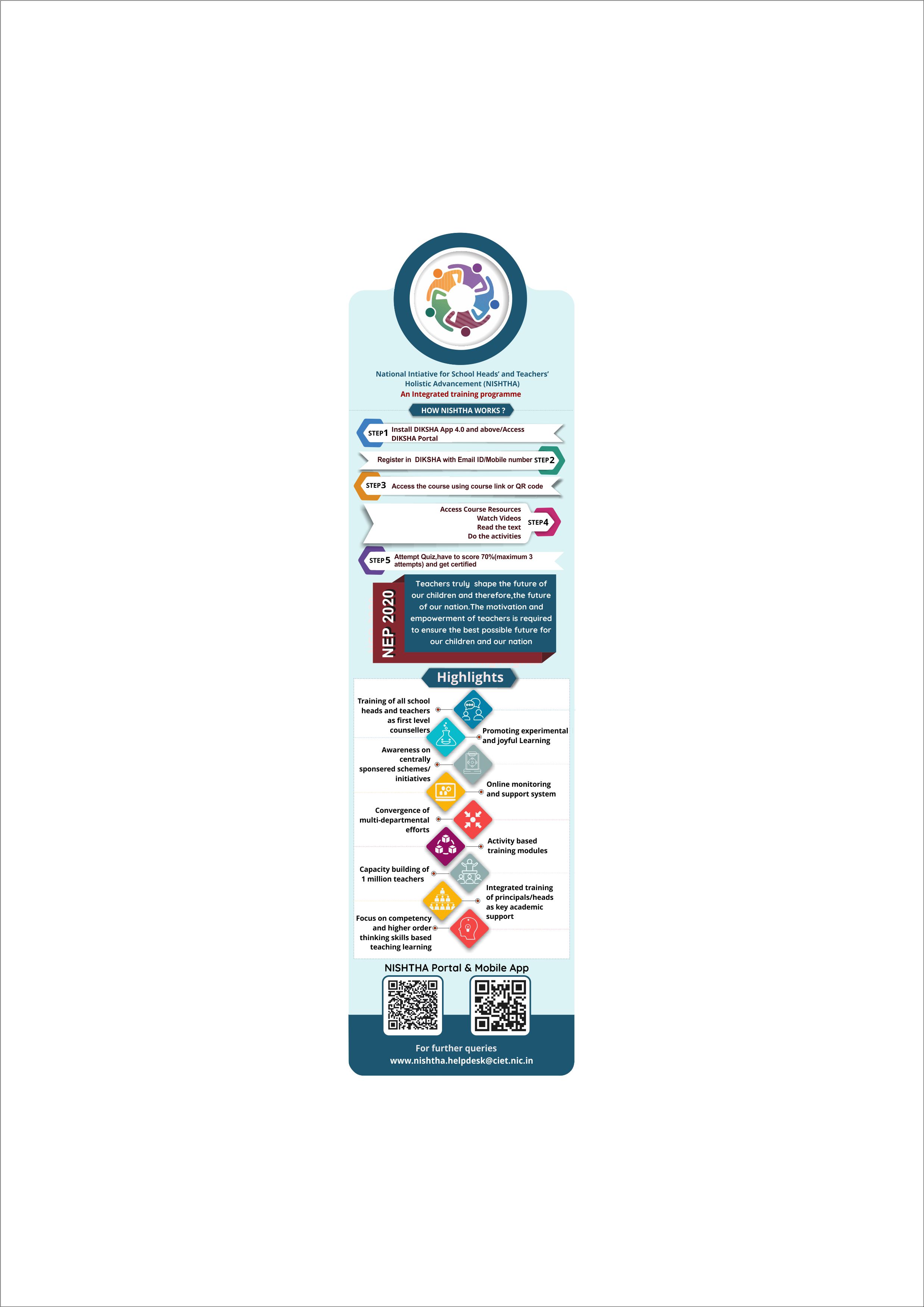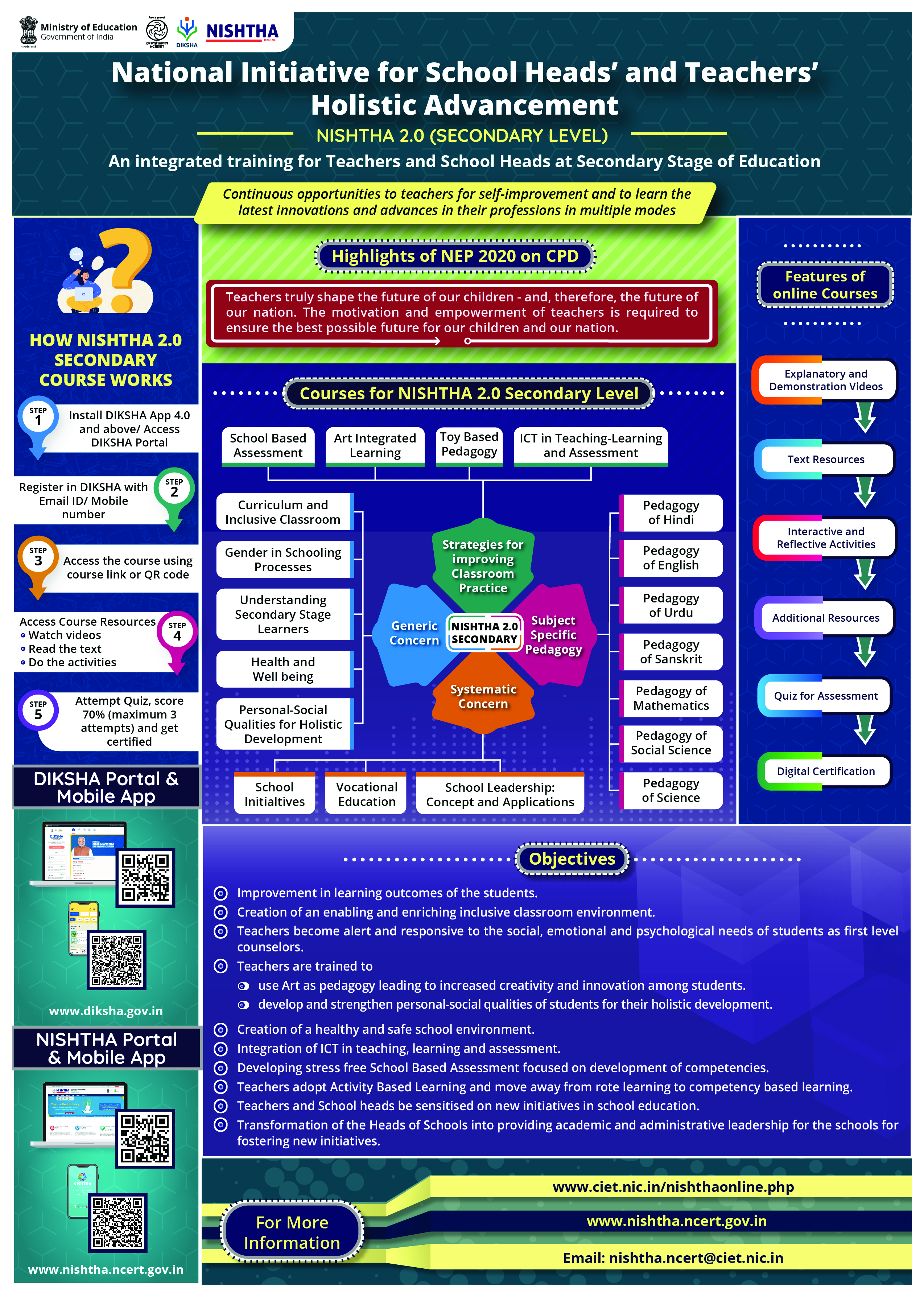 The National Education Policy (NEP) 2020 states that "Teachers truly shape the future of our children and therefore, the future of our Nation. The motivation and empowerment of teachers is required to ensure the best possible future of our children and nation”. As per the recommendation of NEP 2020, every teacher and head teacher is expected to participate in at least 50 hours of Continuous Professional Development (CPD) opportunities every year for their own professional development, driven by their own interests. CPD opportunities will, in particular, systematically cover the latest pedagogies regarding foundational literacy and numeracy, formative and adaptive assessment of learning outcomes, competency-based learning, and related pedagogies, such as experiential learning, arts-integrated, sports-integrated, and storytelling-based approaches, etc. To realize the vision of NEP-2020, recently NCERT in collaboration with States / UTs and autonomous bodies under MoE, MoD and MoTA (CBSE, KVS, NVS, CTSA, AEES, Sainik School, CICSE etc) have initiated the NISHTHA 2.0 online Integrated Teacher Training programme for different stages of school education.