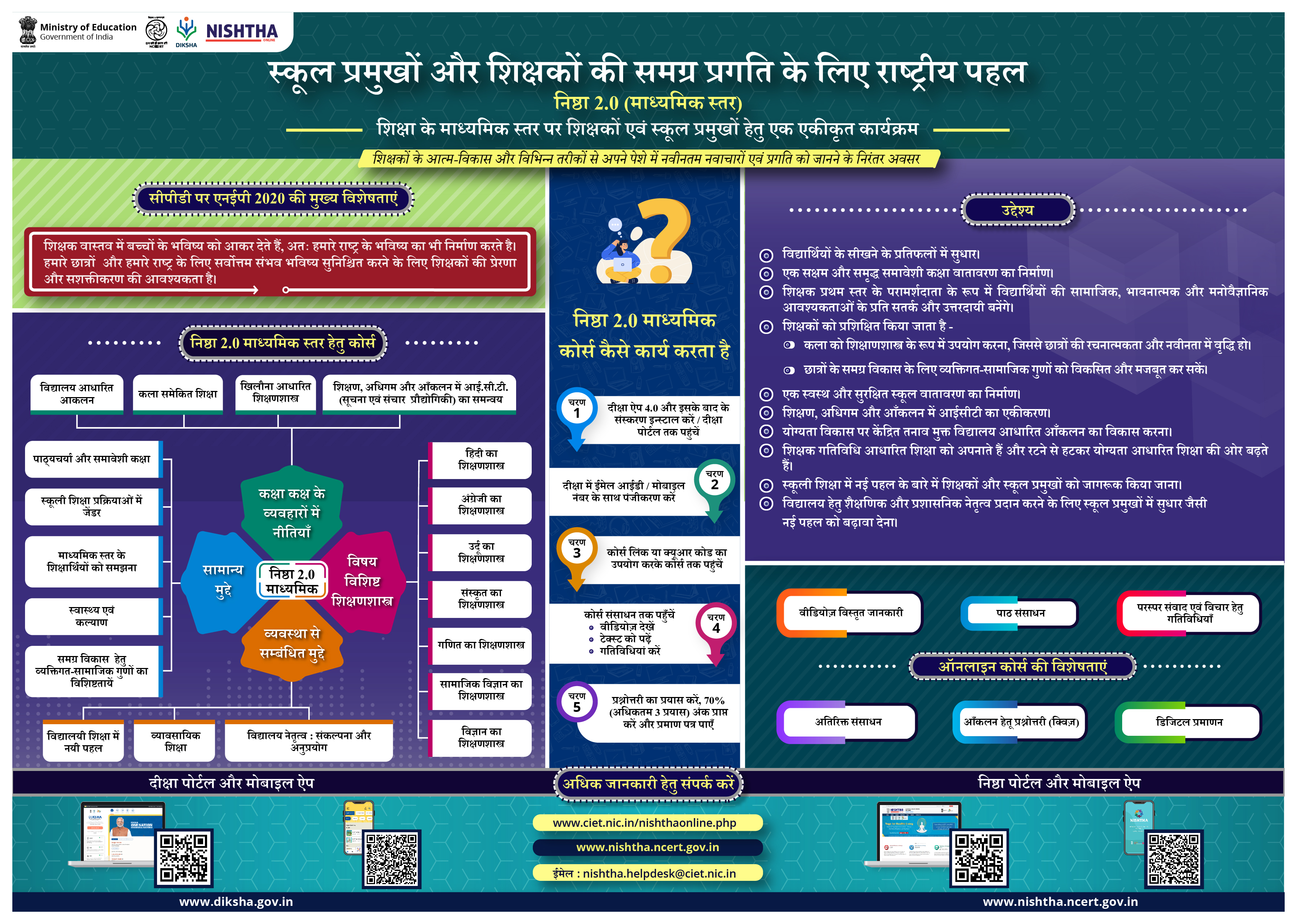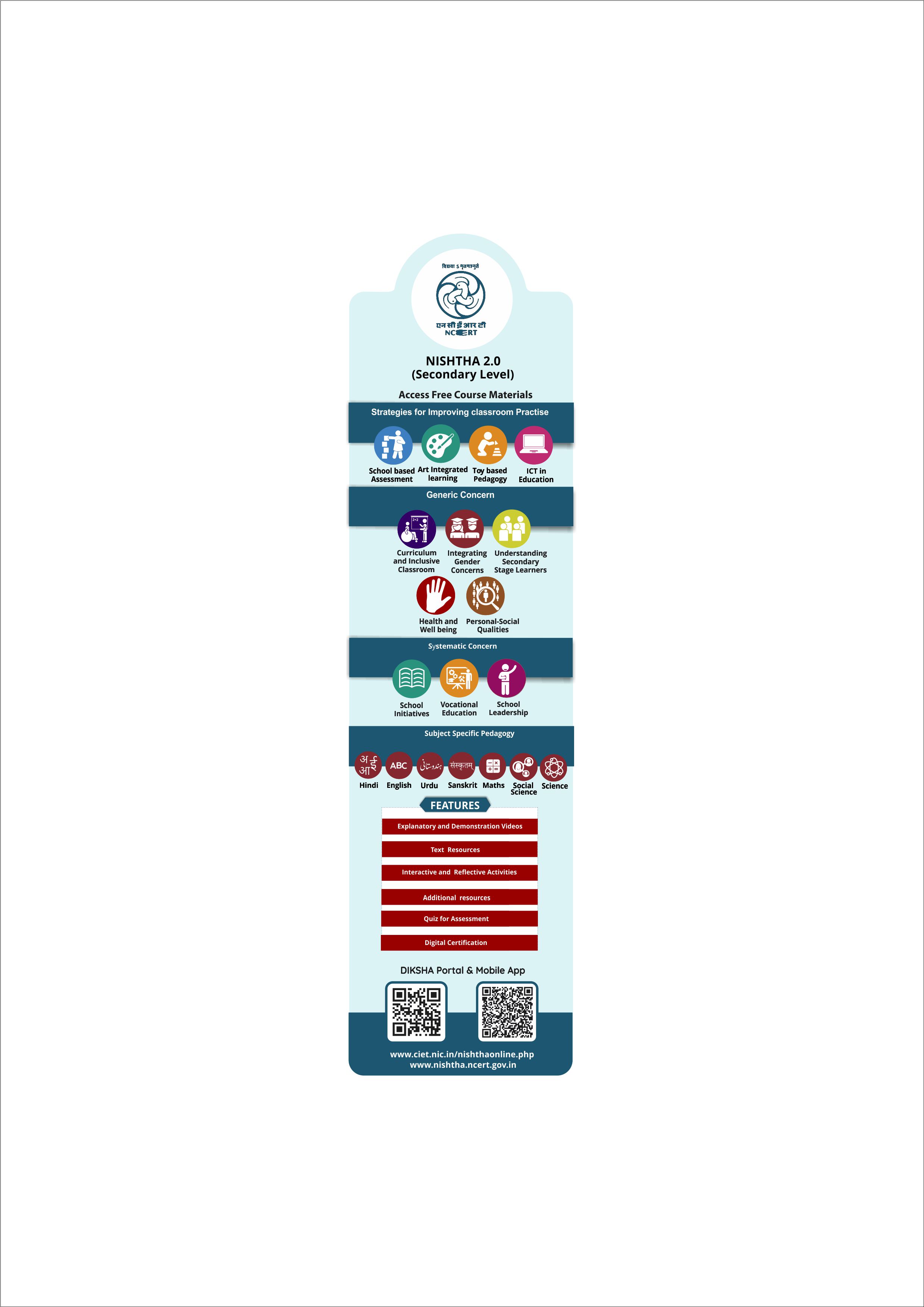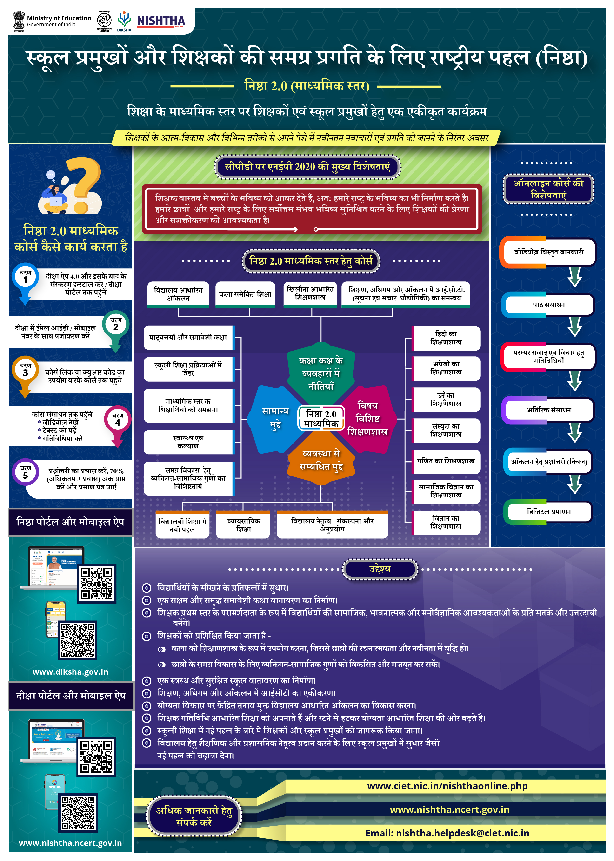 The National Education Policy (NEP) 2020 states that "Teachers truly shape the future of our children and therefore, the future of our Nation. The motivation and empowerment of teachers is required to ensure the best possible future of our children and nation”. As per the recommendation of NEP 2020, every teacher and head teacher is expected to participate in at least 50 hours of Continuous Professional Development (CPD) opportunities every year for their own professional development, driven by their own interests. CPD opportunities will, in particular, systematically cover the latest pedagogies regarding foundational literacy and numeracy, formative and adaptive assessment of learning outcomes, competency-based learning, and related pedagogies, such as experiential learning, arts-integrated, sports-integrated, and storytelling-based approaches, etc. To realize the vision of NEP-2020, recently NCERT in collaboration with States / UTs and autonomous bodies under MoE, MoD and MoTA (CBSE, KVS, NVS, CTSA, AEES, Sainik School, CICSE etc) have initiated the NISHTHA 2.0 online Integrated Teacher Training programme for different stages of school education.