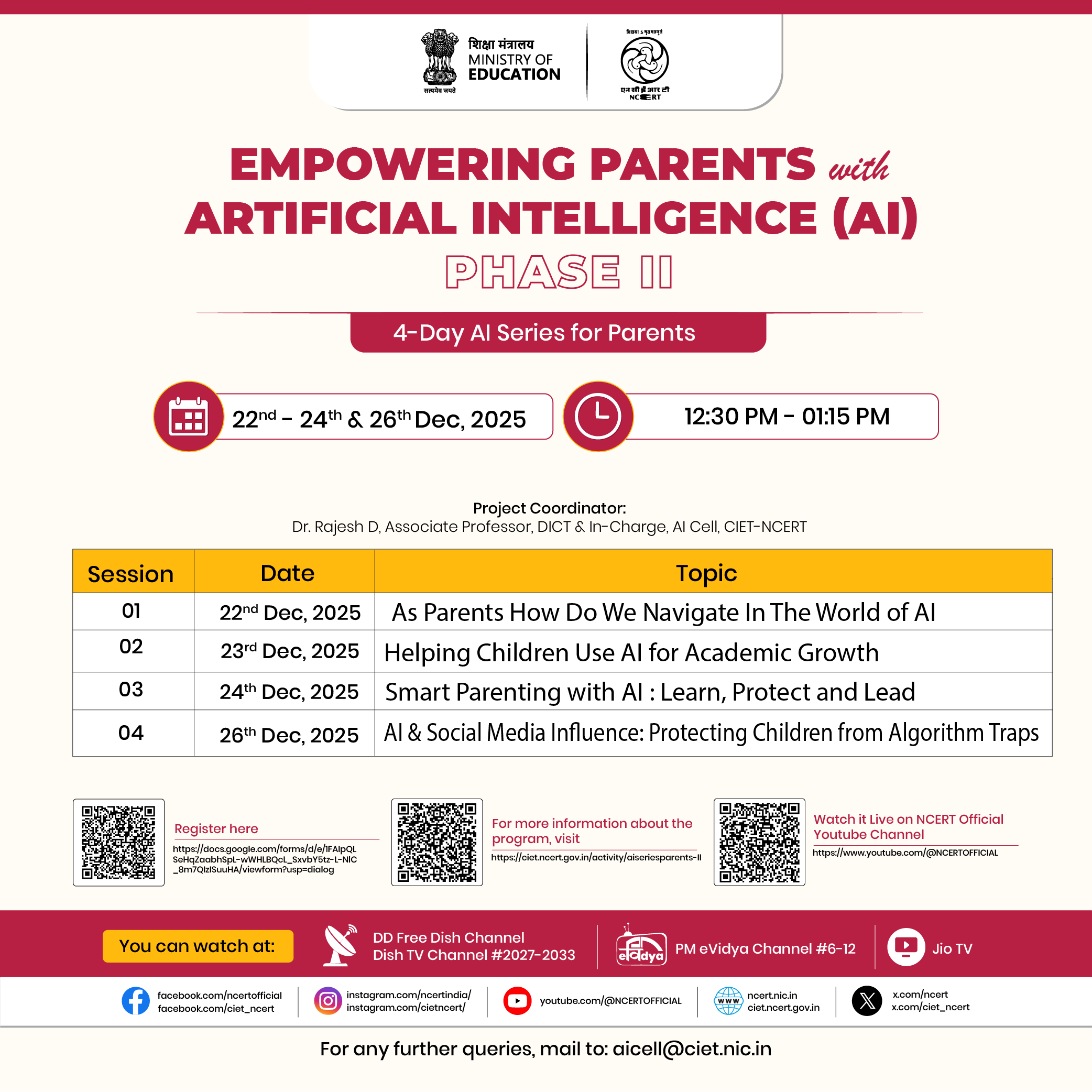 To help parents better understand this new learning environment, a four-days YouTube Live Session Series on “Empowering Parents with AI, Phase-II” has been designed. These sessions will not only explain what AI is and how it’s used in schools but will also guide parents on how to support their children’s learning at home. Through simple, real-life examples—from AI in creative writing and school projects to its use in games, art, and everyday problem-solving—parents will gain insights into how AI can enhance education when used thoughtfully. The training will be conducted from 22-24, 26 December 2025, with live sessions every day from 12:30 PM to 01:15 PM. Parents can join the sessions live on NCERT’s Official YouTube Channel, as well as on PM eVidya DTH TV Channels (6–12) and the Jio TV mobile app.