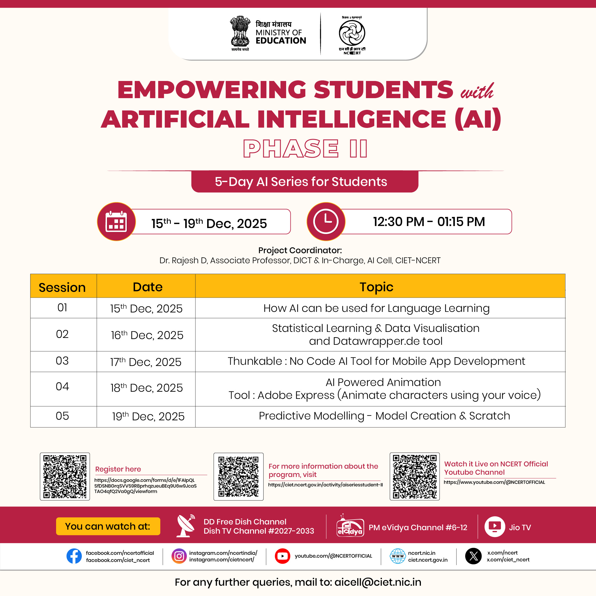 Aligned with the vision of the National Education Policy (NEP) 2020 and the National Curriculum Framework (NCF), this programme aims to help students become confident and responsible users of AI. It encourages curiosity, creativity, and care in how technology is used in education and beyond. The training will be conducted from 15 - 19 December, 2025, with live sessions every day from 12:30 PM to 01:15 PM. Students can join the sessions live on NCERT’s Official YouTube Channel, as well as on PM eVidya DTH TV Channels (6–12) and the Jio TV mobile app.