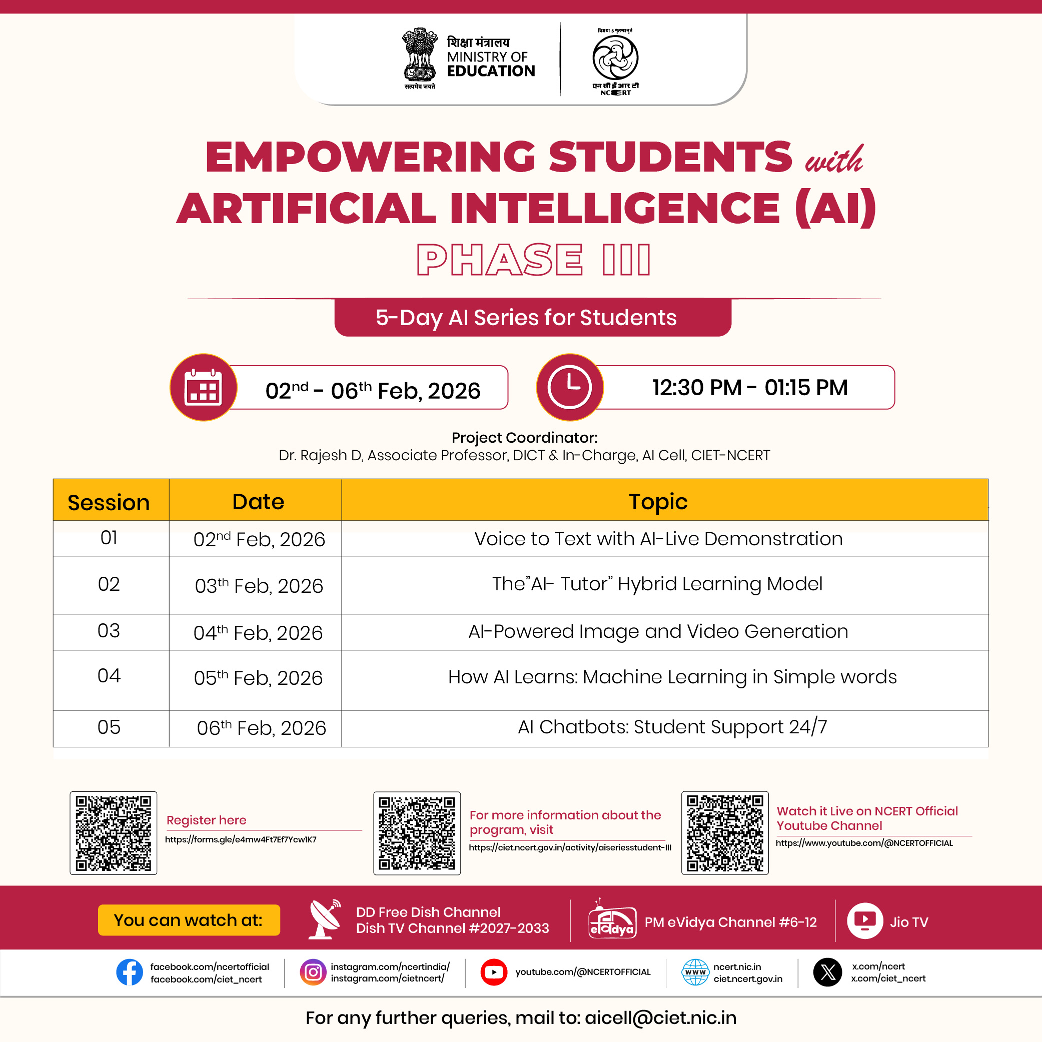 Aligned with the vision of the National Education Policy (NEP) 2020 and the National Curriculum Framework (NCF), this programme aims to help students become confident and responsible users of AI. It encourages curiosity, creativity, and care in how technology is used in education and beyond. The training will be conducted from 02 February to 06 February 2026, with live sessions every day from 12:30 PM to 01:30 PM. Students can join the sessions live on NCERT’s Official YouTube Channel, as well as on PM eVidya DTH TV Channels (6–12) and the Jio TV mobile app.