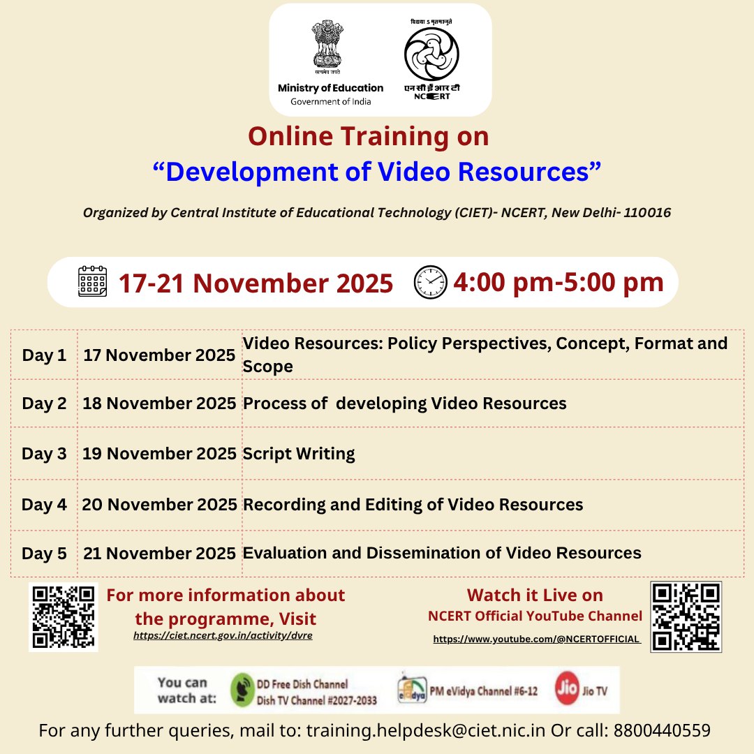 Aligned with the vision of the National Education Policy 2020, CIET-NCERT is organising a five hours online training programme titled “Development of Video Resources” starting from 17 to 21 November, 2025 in English version from 4.00 pm - 5.00 pm. The sessions will shed light on What? Why? How? of video resources. The sessions will be broadcast live on NCERT’s YouTube Channel https://www.youtube.com/c/NCERTOFFICIAL and simulcast on PM e-Vidya DTH TV Channels (6 to 12) and the Jio TV mobile app. Participants will also be able to access recorded sessions through a dedicated YouTube playlist, allowing them to revisit essential pedagogical concepts and instructional strategies at their convenience.